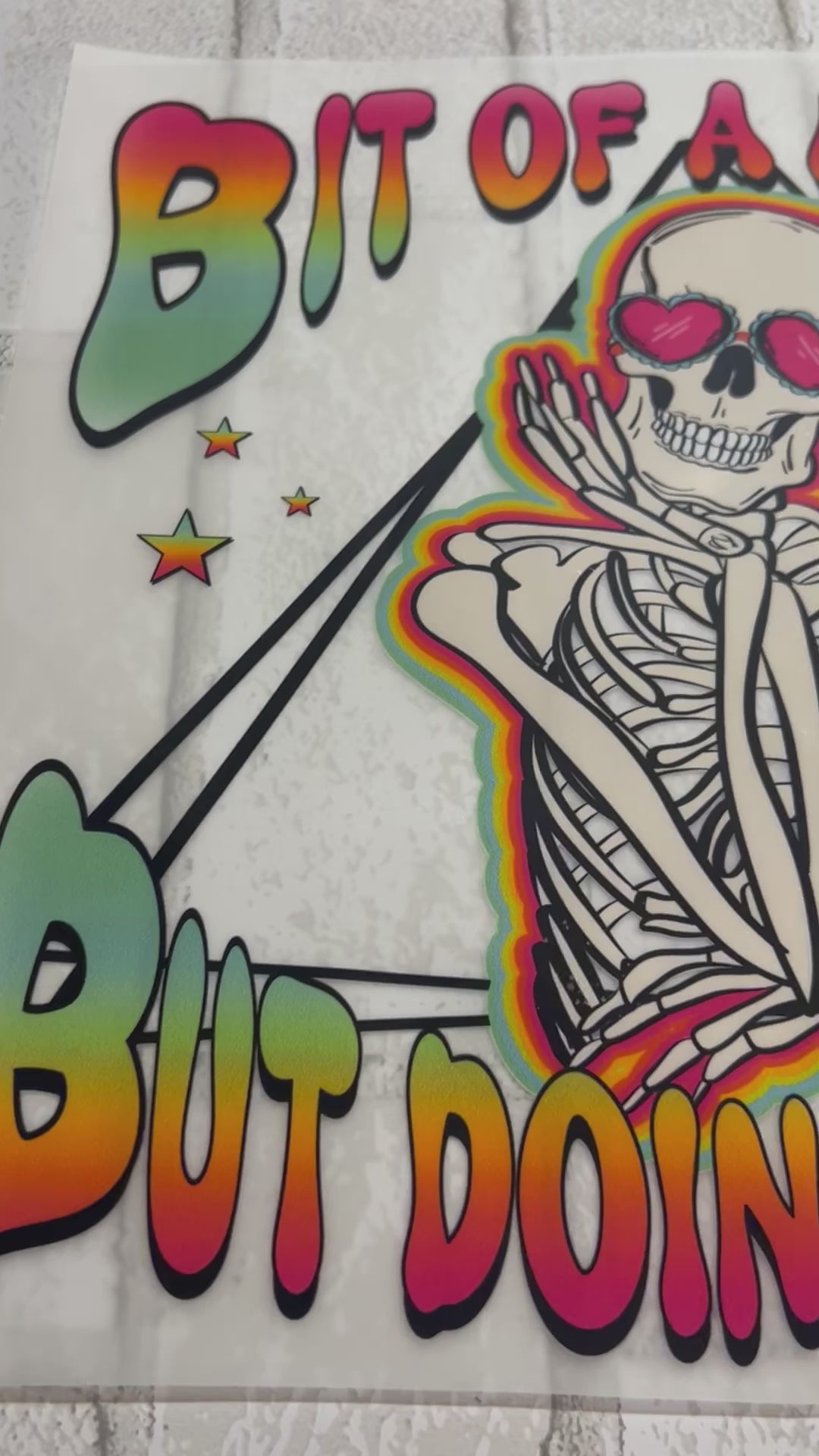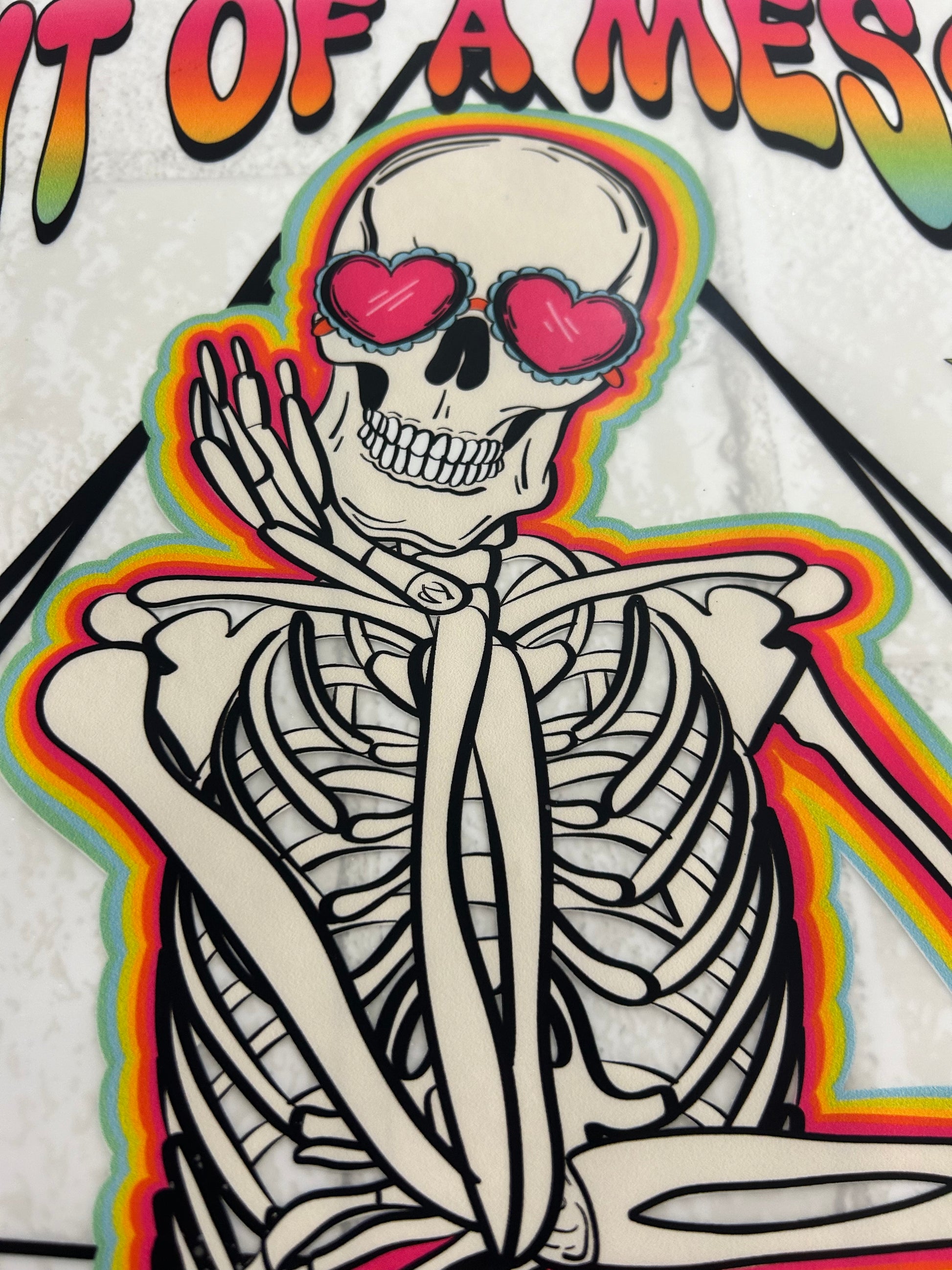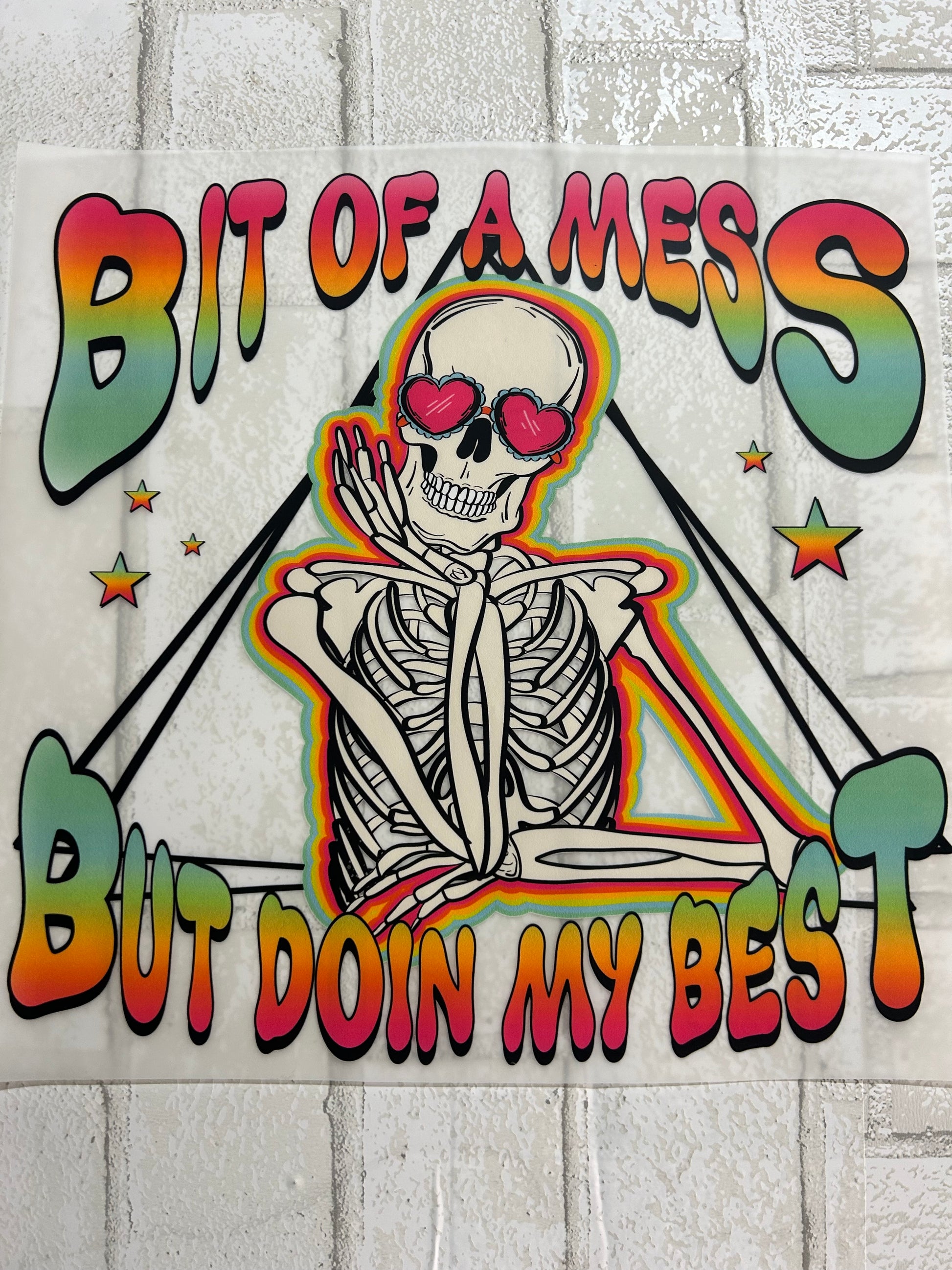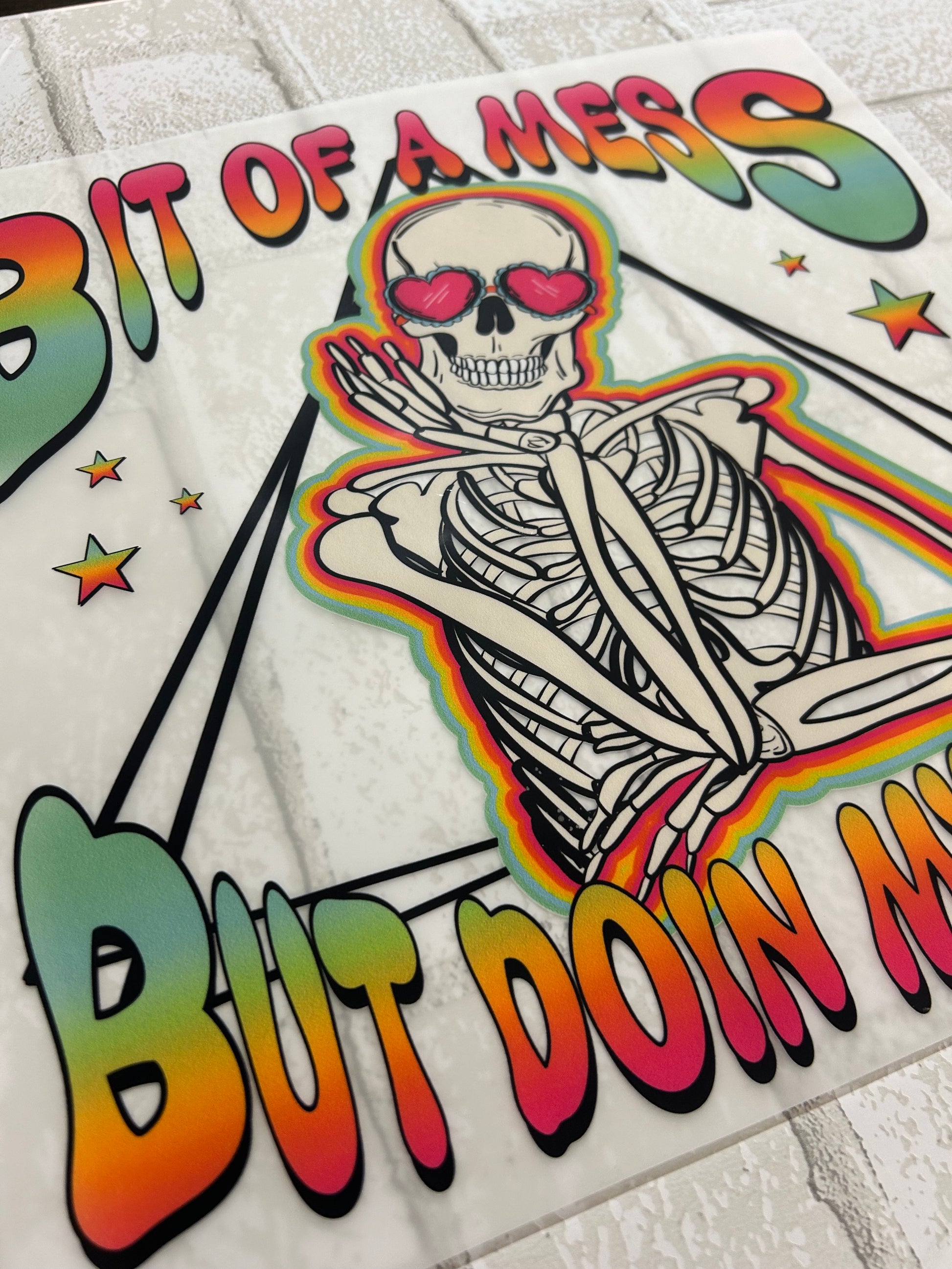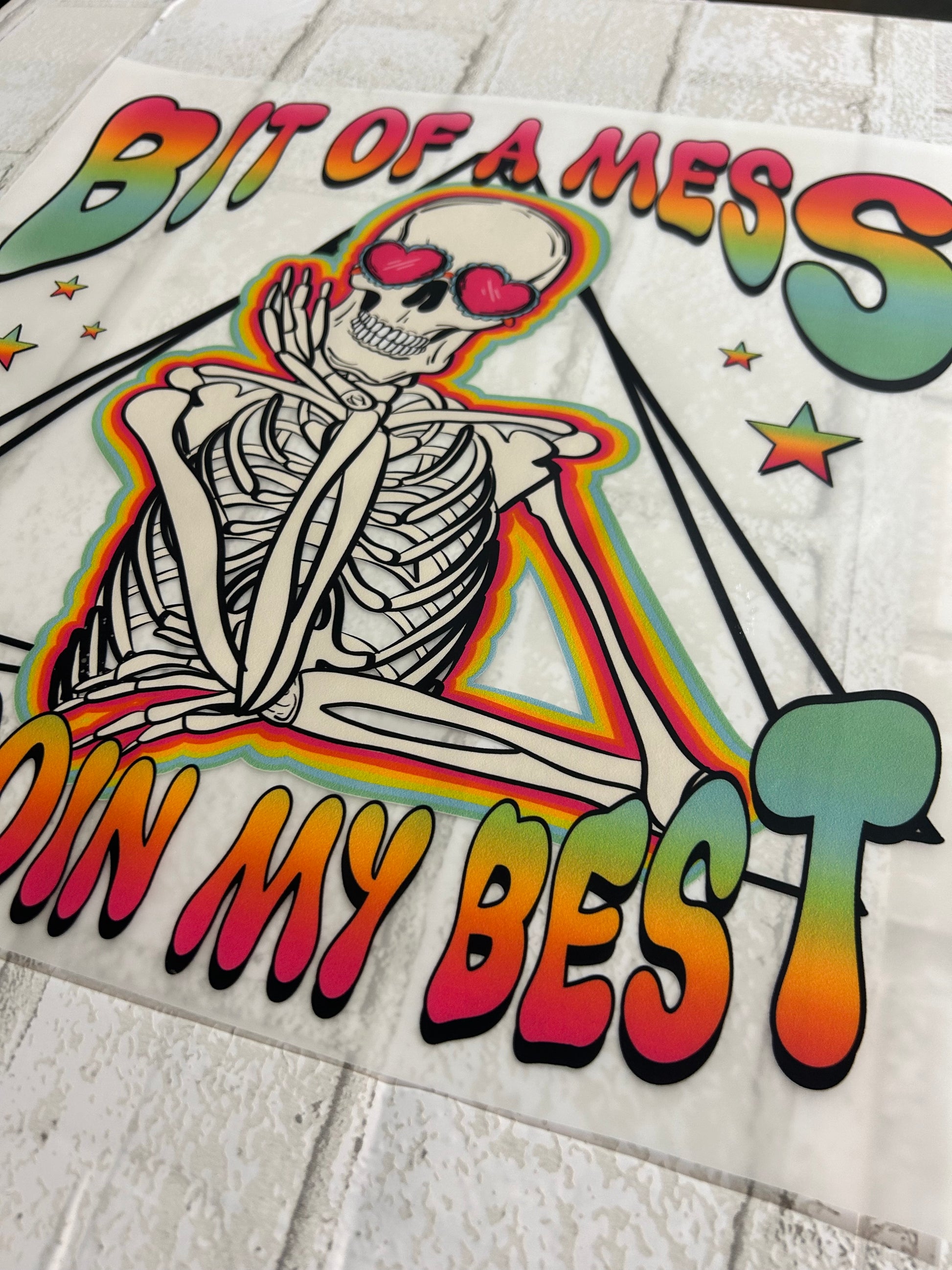 Embrace the chaos with our DTF Transfer | Bit of a Mess but Doin My Best! This colorful and playful skeleton design is the perfect way to add a touch of fun and personality to your wardrobe.