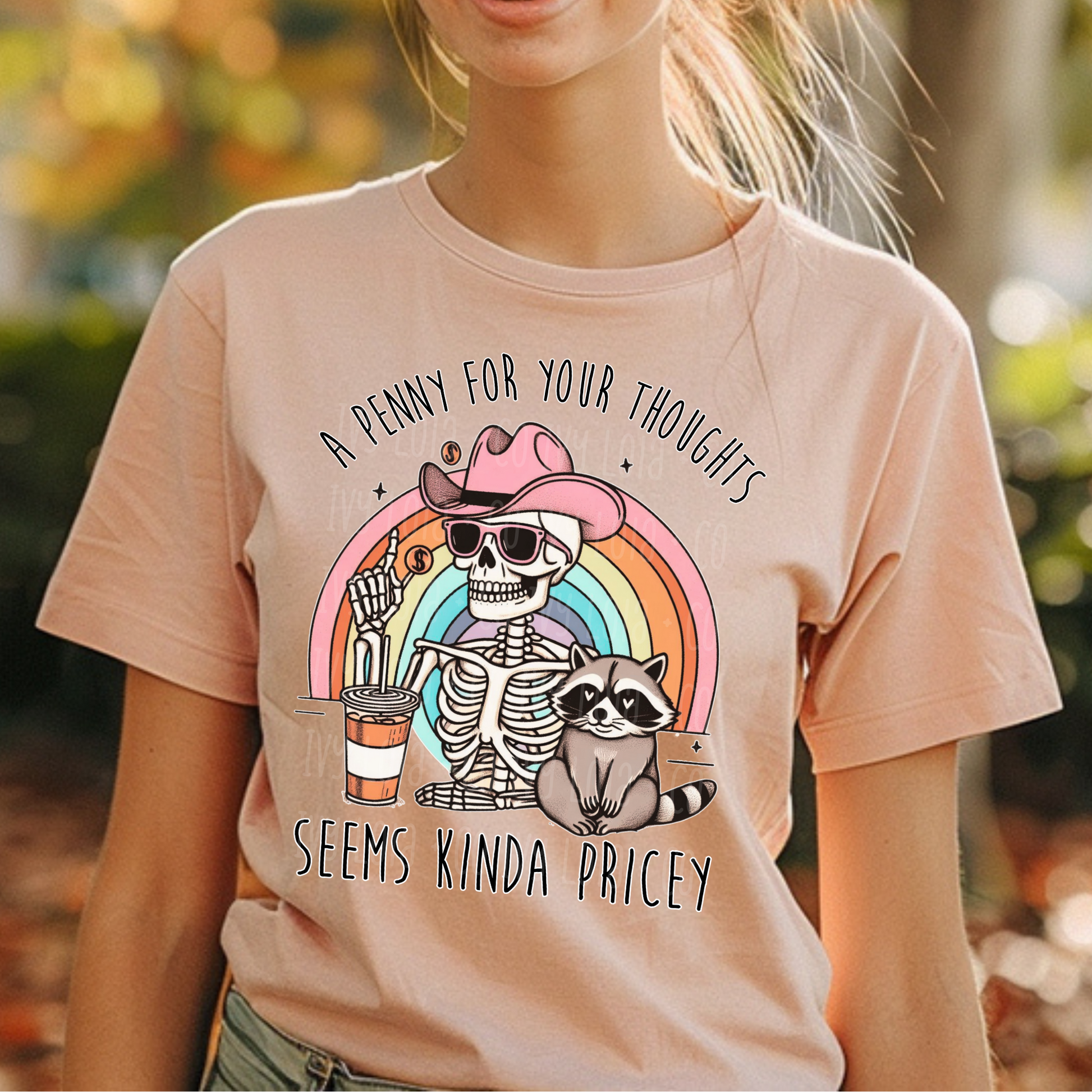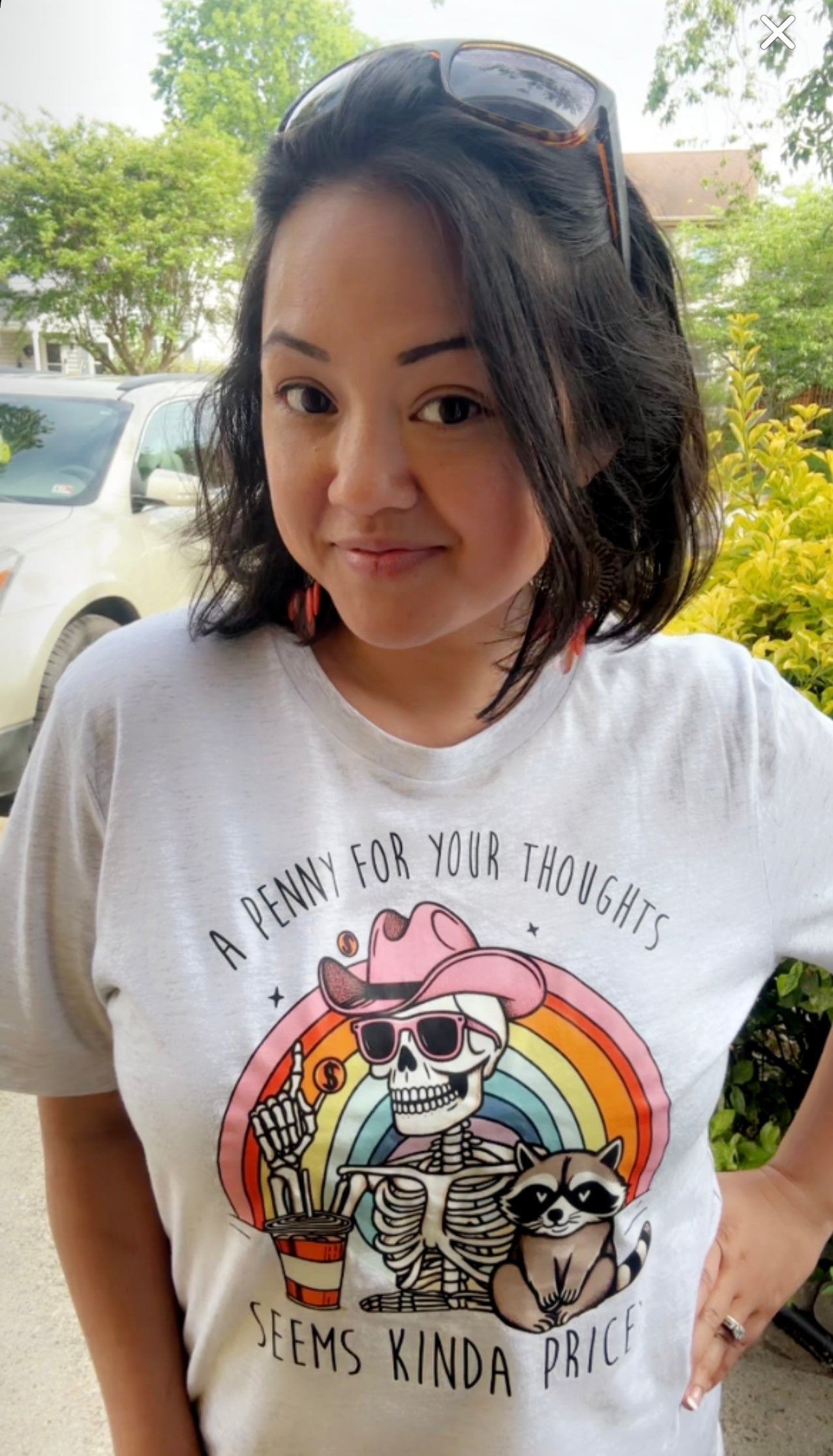 Don't just wear a shirt—wear a statement. Grab your A Penny for Your Thoughts Witty Graphic Women's Tee today and let your personality shine!
