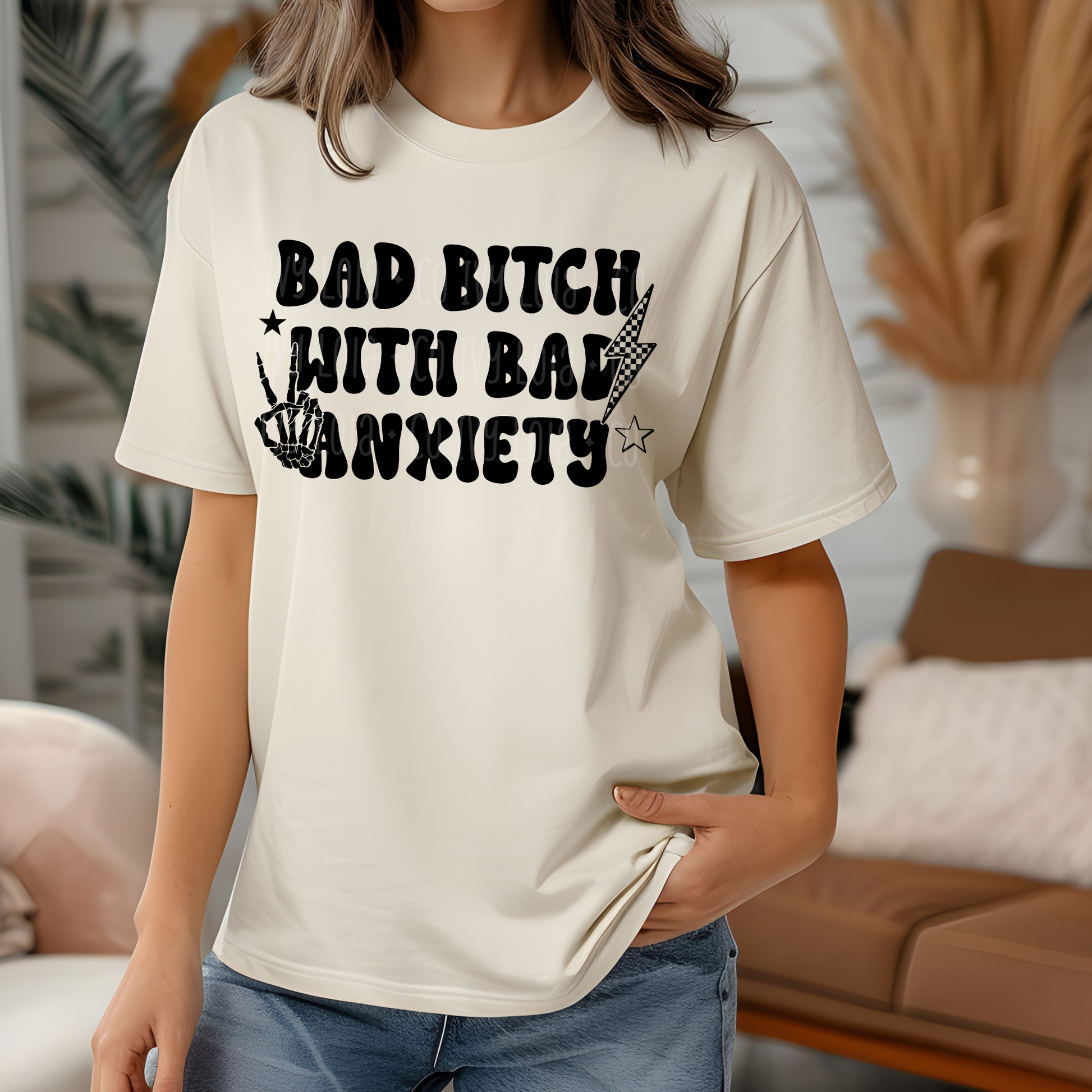 Introducing the Bad Bitch with Bad Anxiety Graphic Tee or Sweatshirt - a bold fashion statement that blends style with a touch of vulnerability. This unique apparel is perfect for those who embrace their strength while acknowledging their struggles.