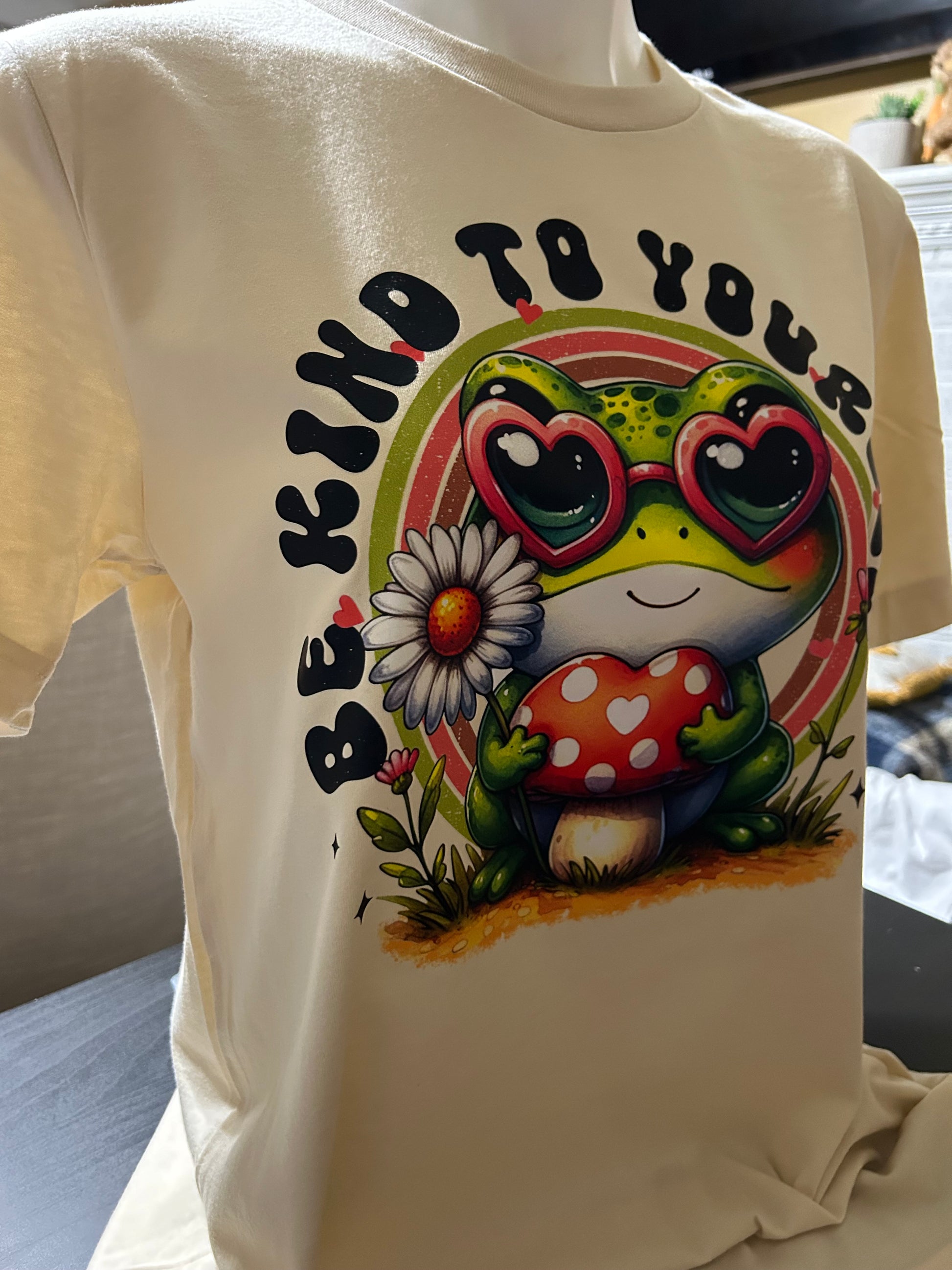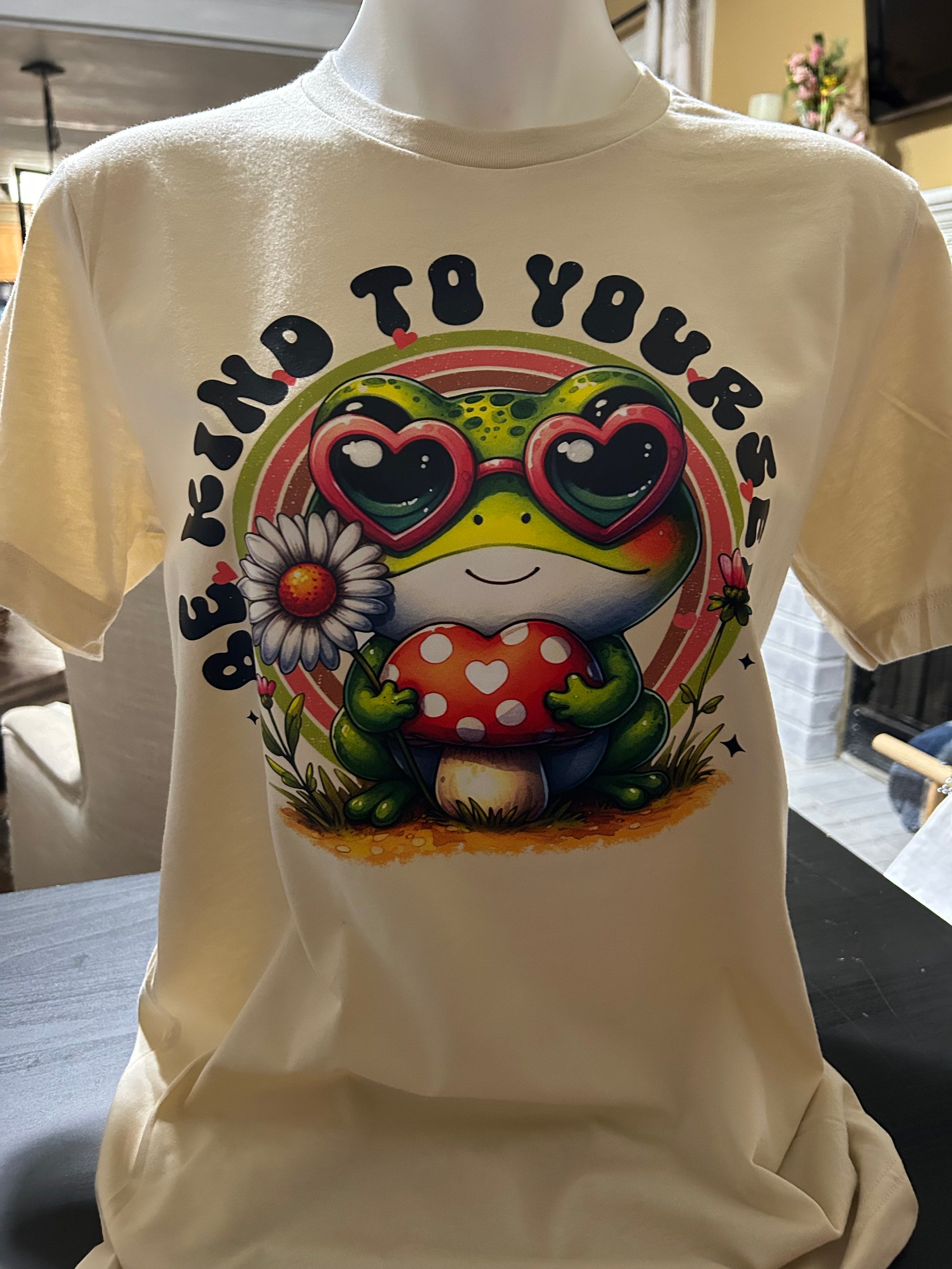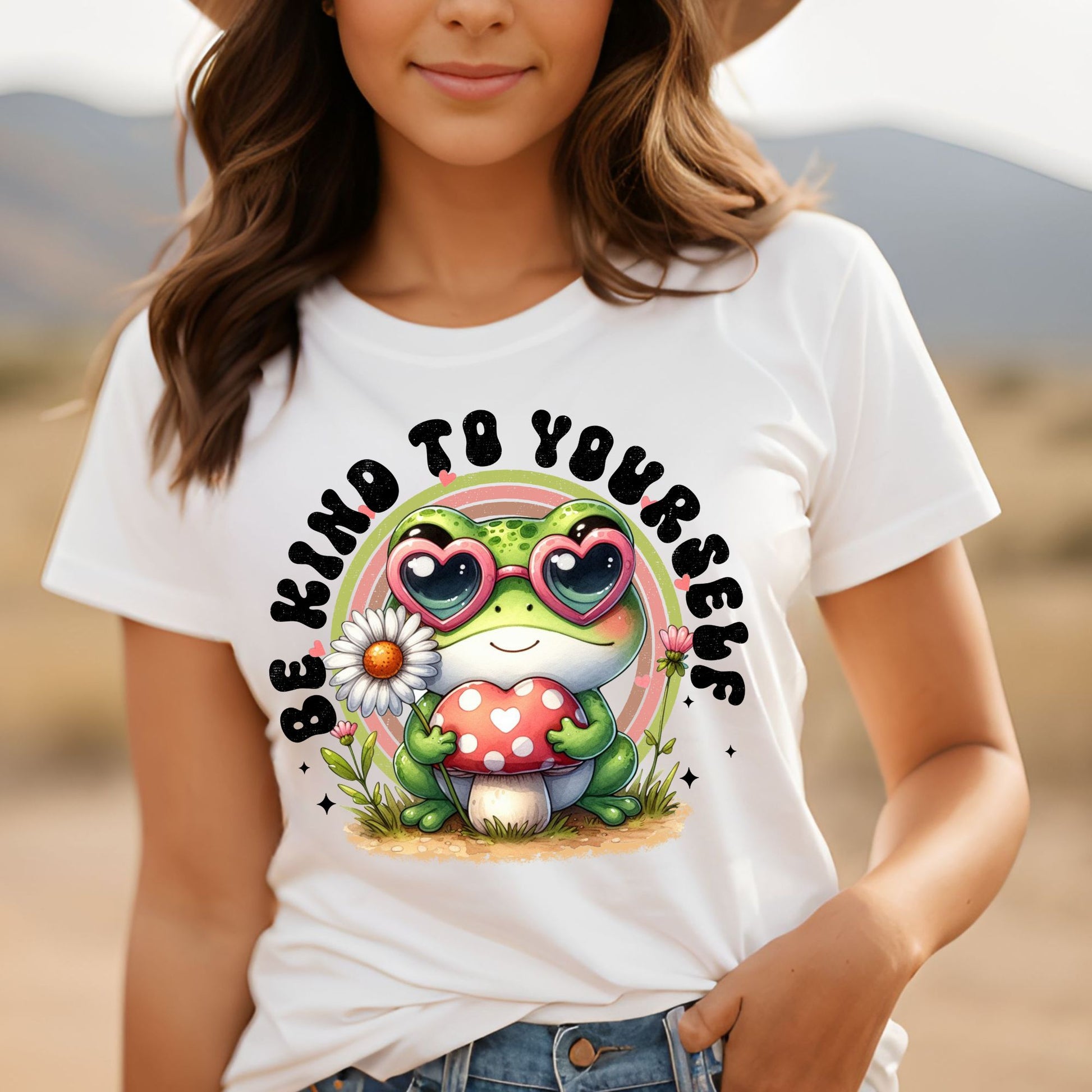 Spread joyful vibes and self-love with the groovy "Be Kind to Yourself" tee featuring a playful frog graphic! This vibrant shirt empowers you to embrace compassion and nurturing self-care.