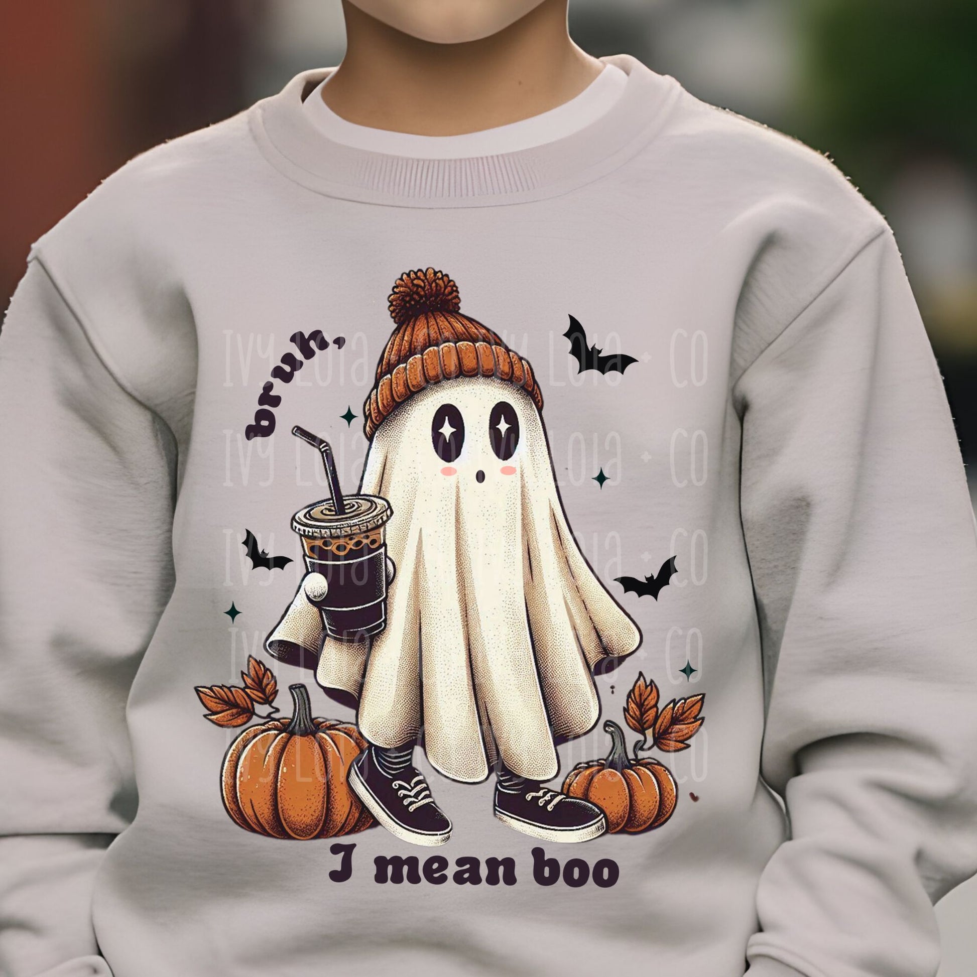 Unleash your child's wild spirit with our uniquely designed Bruh I Mean Boo Halloween Ghost Sweater. This youth apparel is perfect for those who love the holiday!