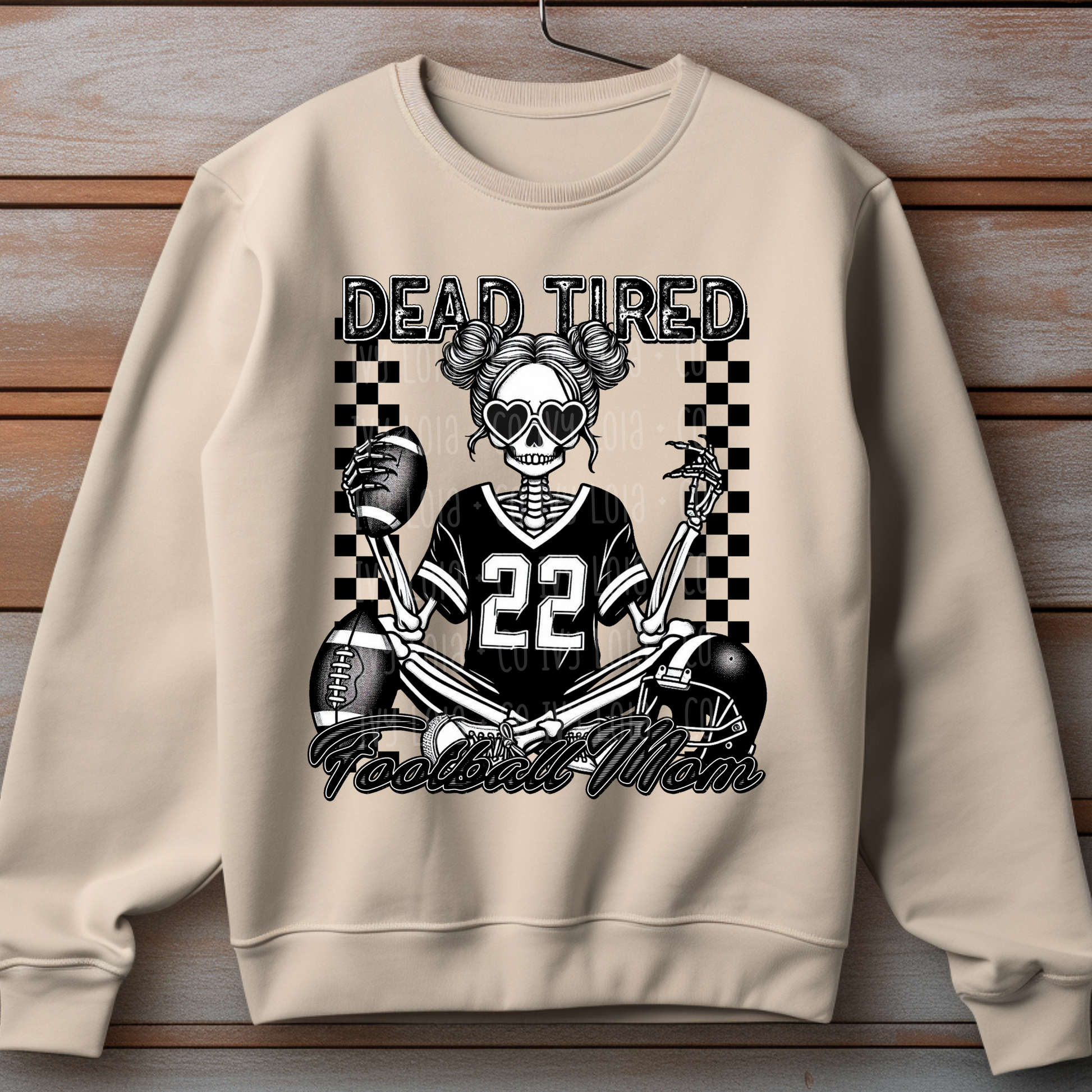 • Soft and comfy t-shirt with a "Dead Tired Football Mom" Skeleton graphic