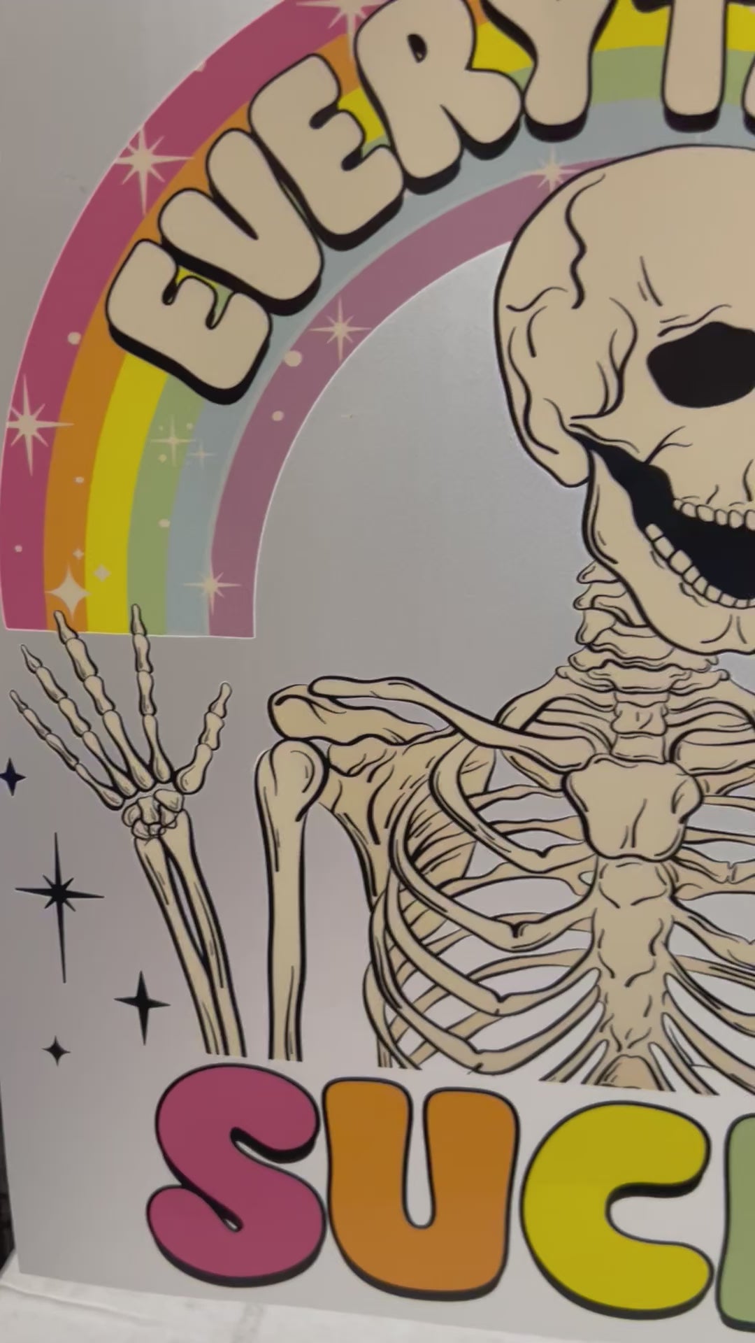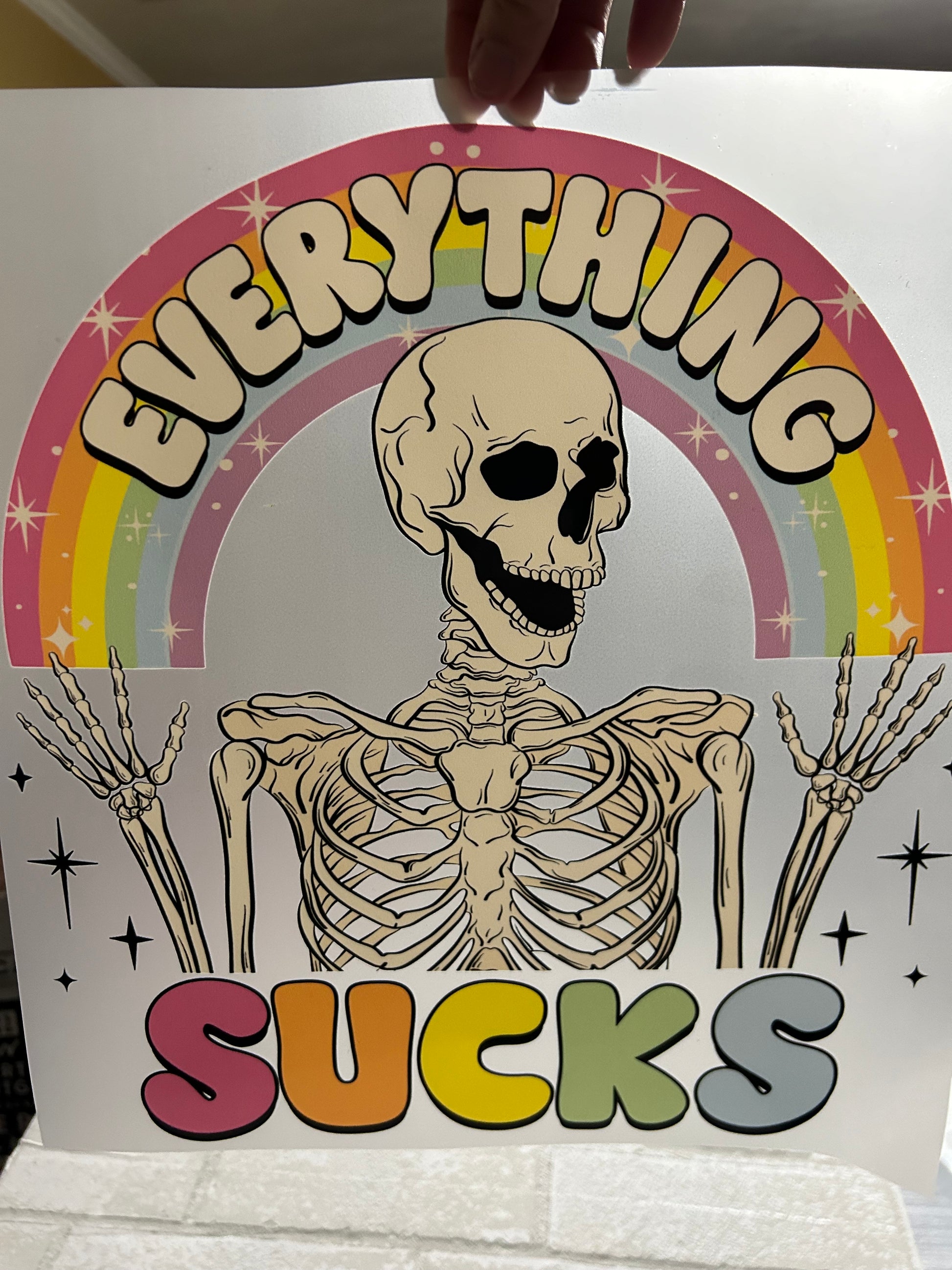 Sick of the same old boring designs? This sarcastic, colorful skeleton transfer is here to spice up your wardrobe and tell the world "Everything Sucks" in style.