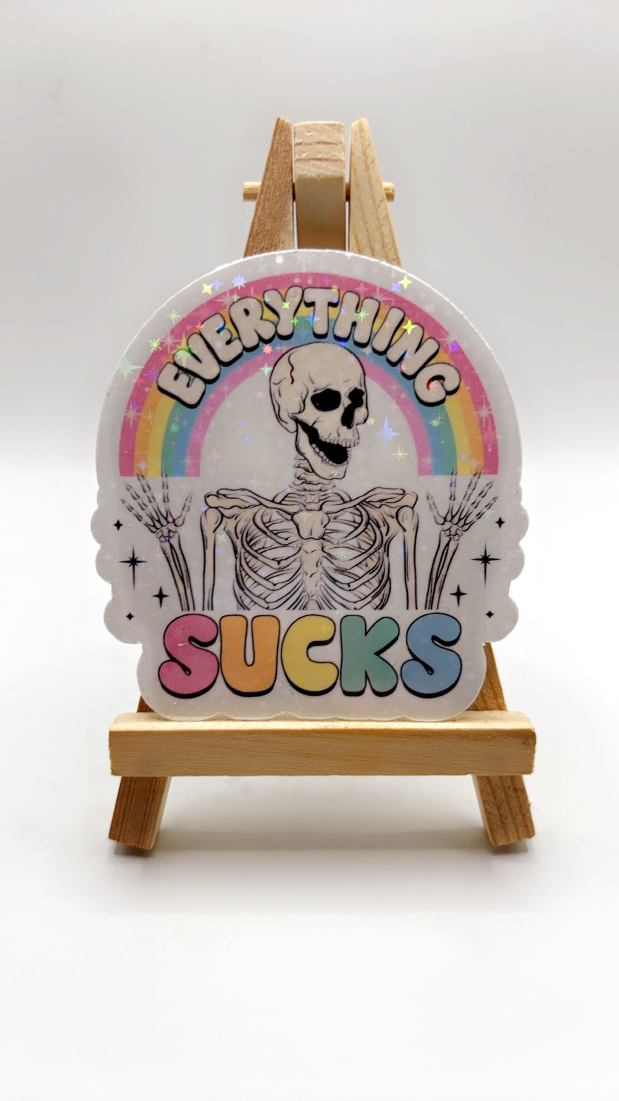 Add a touch of humor and authenticity to your belongings with the Everything Sucks Sticker. This unique sticker is perfect for expressing your feelings in a light-hearted way.