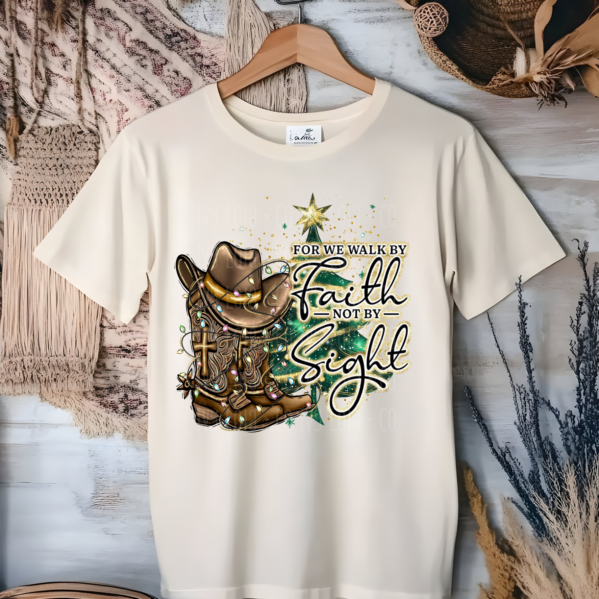 For We Walk by Faith Not by Sight Graphic Christmas Tee or Cozy Sweater