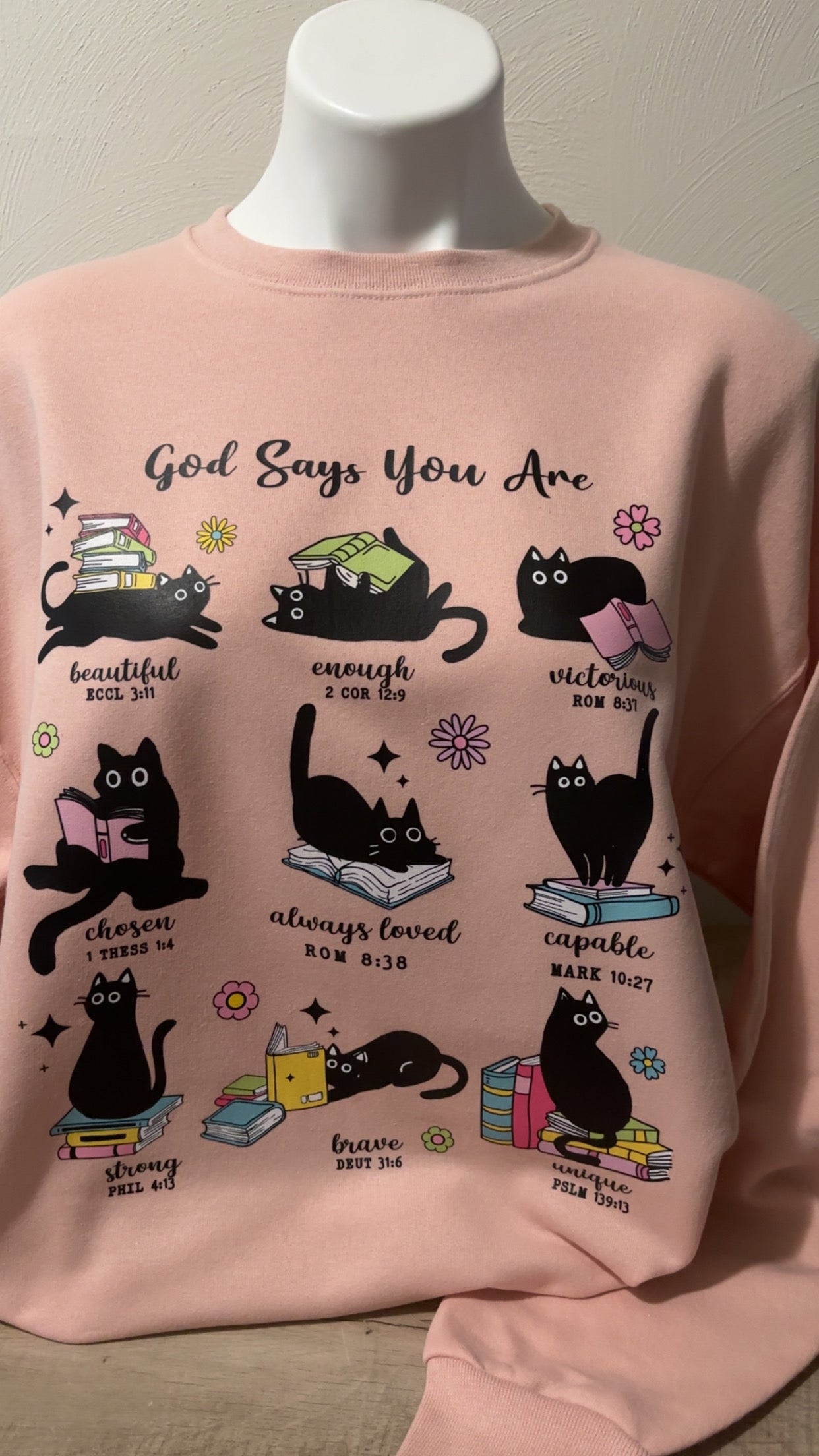 Elevate your style and spirit with our "God Says You Are" Uplifting Bible Verses Crewneck Sweater. This sweater is the ultimate in comfort and style, offering a soft and comfortable feel against your skin while featuring a colorful and fun design paired with a premium quality, light pink material that is sure to brighten up any outfit.