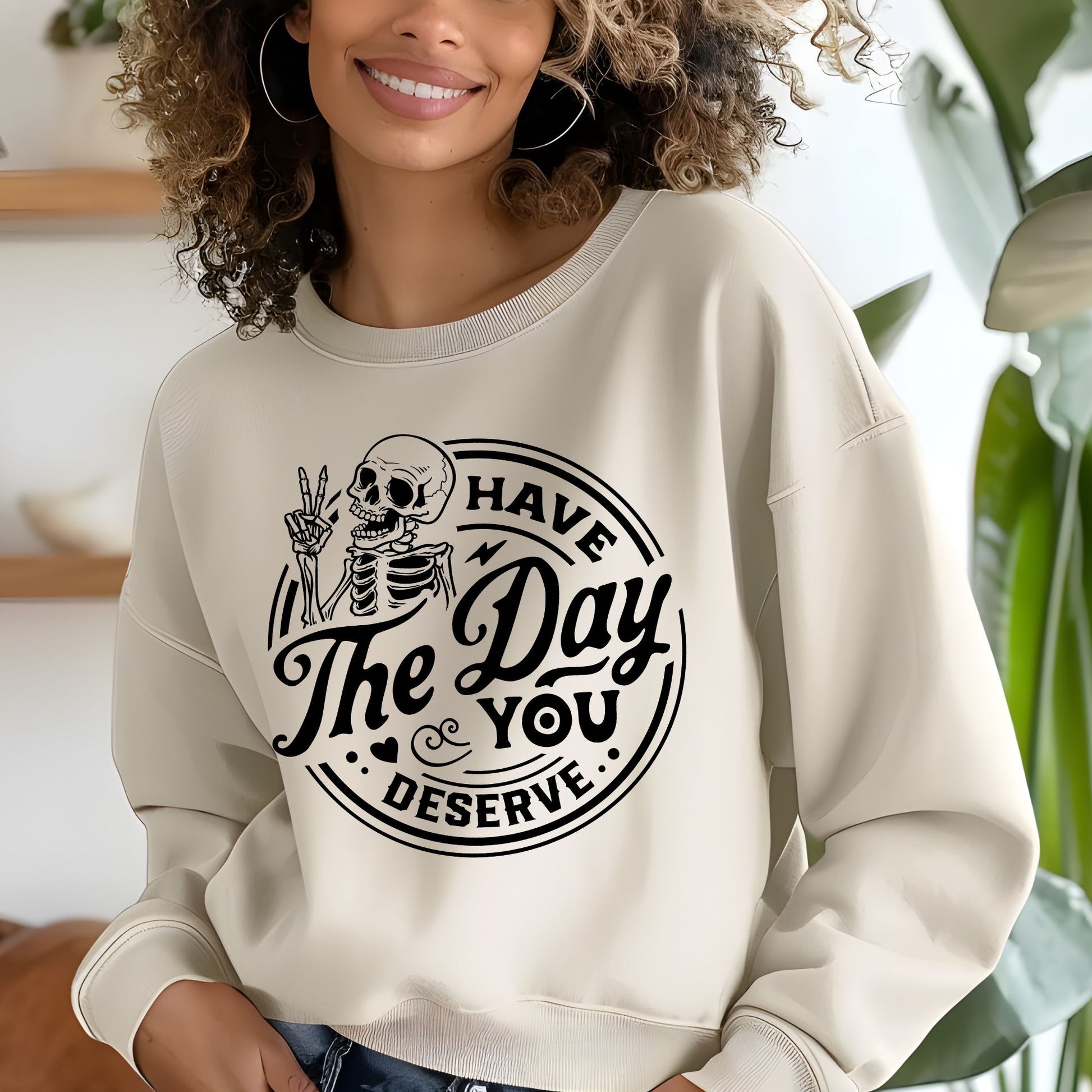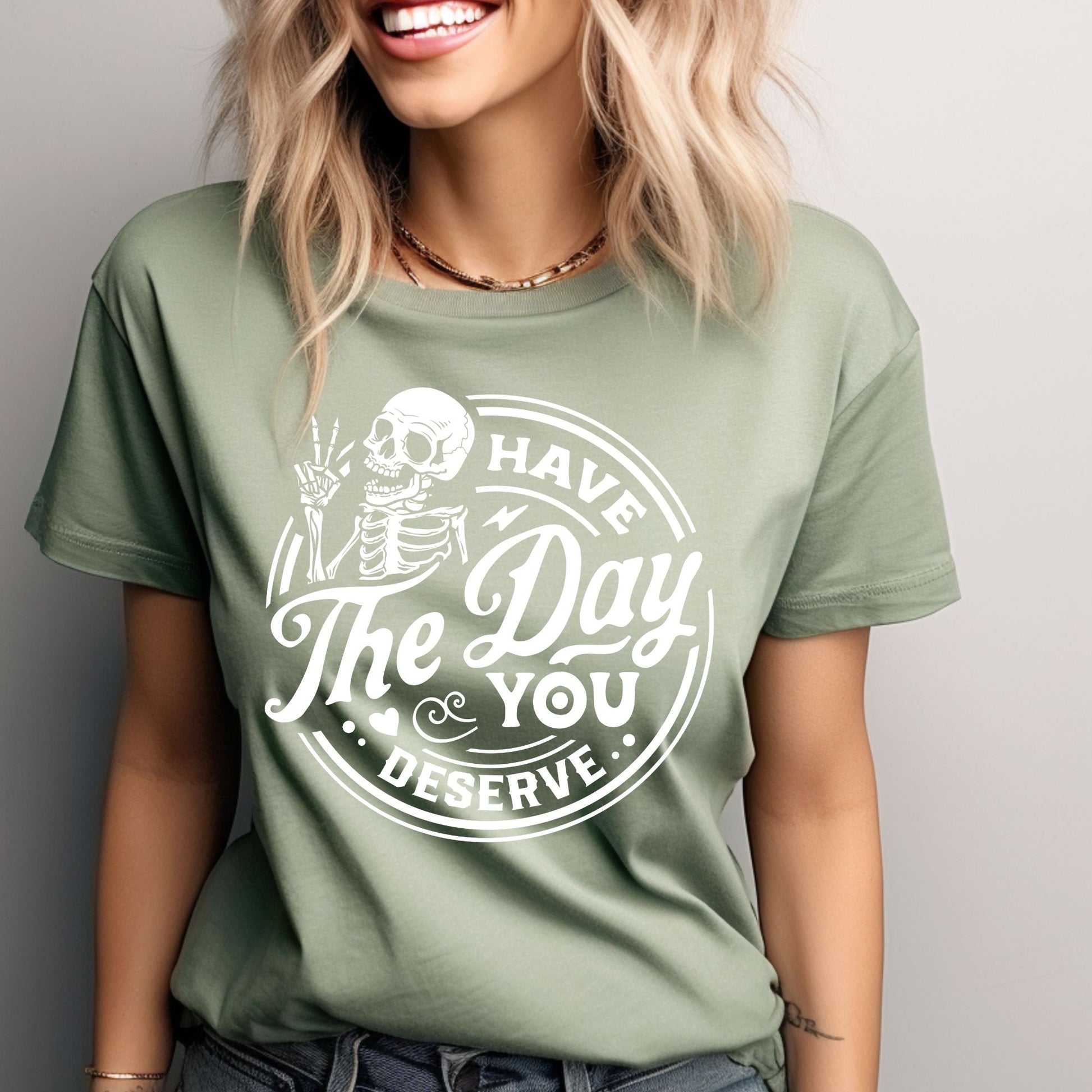 Introducing our "Have the Day You Deserve" T-shirt, designed to add a touch of skeleton humor to your wardrobe. Crafted with the utmost attention to quality, this t-shirt is made from premium fabric that ensures comfort and durability. With its custom design, it's a unique piece that will make you stand out from the crowd. Embrace the day you deserve with this stylish and witty t-shirt.