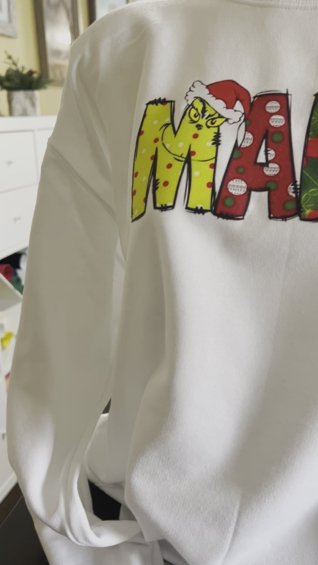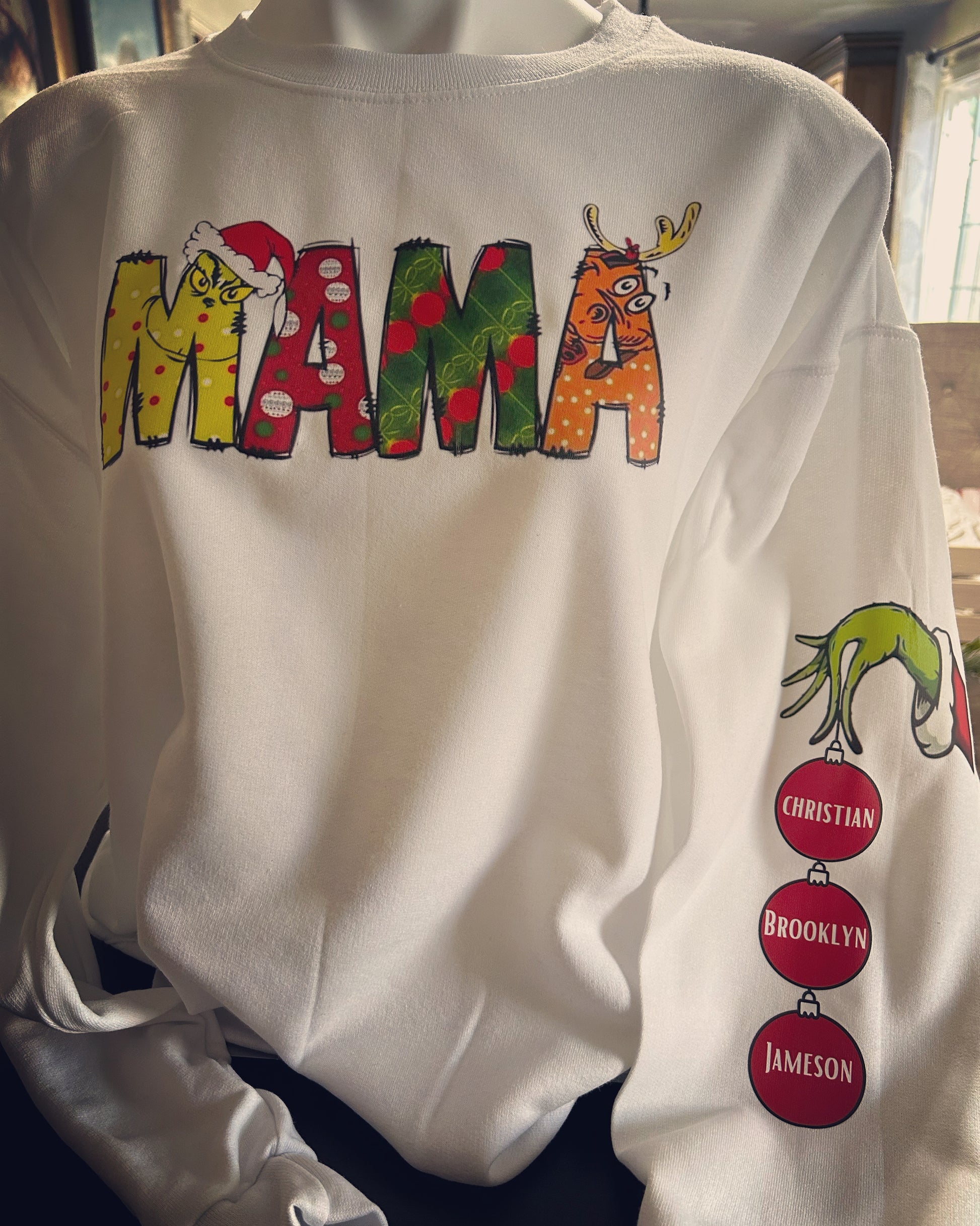 Another exciting addition to our Christmas Sweater Collection! This Grinch themed Mama sweater can be made with a personal touch, Christmas ornaments with your kid’s name(s)! This sweater is the perfect attire for the holiday season. Its colorful and playful design celebrates the festive Christmas spirit and the nostalgia that comes with a holiday classic, making it even more captivating. The sweatshirt's bright and long-lasting colors ensure that it will retain its vibrancy, even after numerous wears and washes. Made from soft and cozy fabric, it offers optimal comfort throughout the day. The sweatshirt features a classic crewneck design, making it suitable for any occasion. Embrace the joy of the holiday season with this personalized sweater! Available in a Crewneck or Pullover Hoodie.