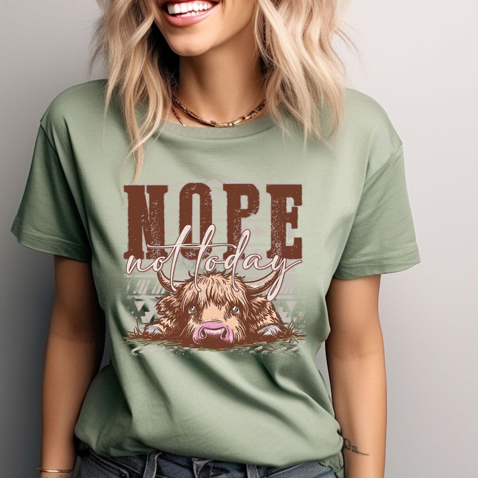 Tired of the same old tees? Elevate your wardrobe with the adorable "Nope Not Today" Highlands Cow Women's Tee. This tee, available in a sage green or beige color, features a cute highlands cow graphic and a fun "Nope Not Today" saying. Made from soft, lightweight fabric, it's perfect for all-day wear. The whimsical cow design adds a touch of quirk and will showcase your fun, playful style. Key features include the unique bovine graphic, eye-catching color, and comfortable fit. Who can resist this charming highland cow? If you love humorous designs, want a tee that starts conversations, and appreciate quality comfort, this "Nope Not Today" shirt is for you. Say nope to boring tops and yes to this instant wardrobe upgrade.