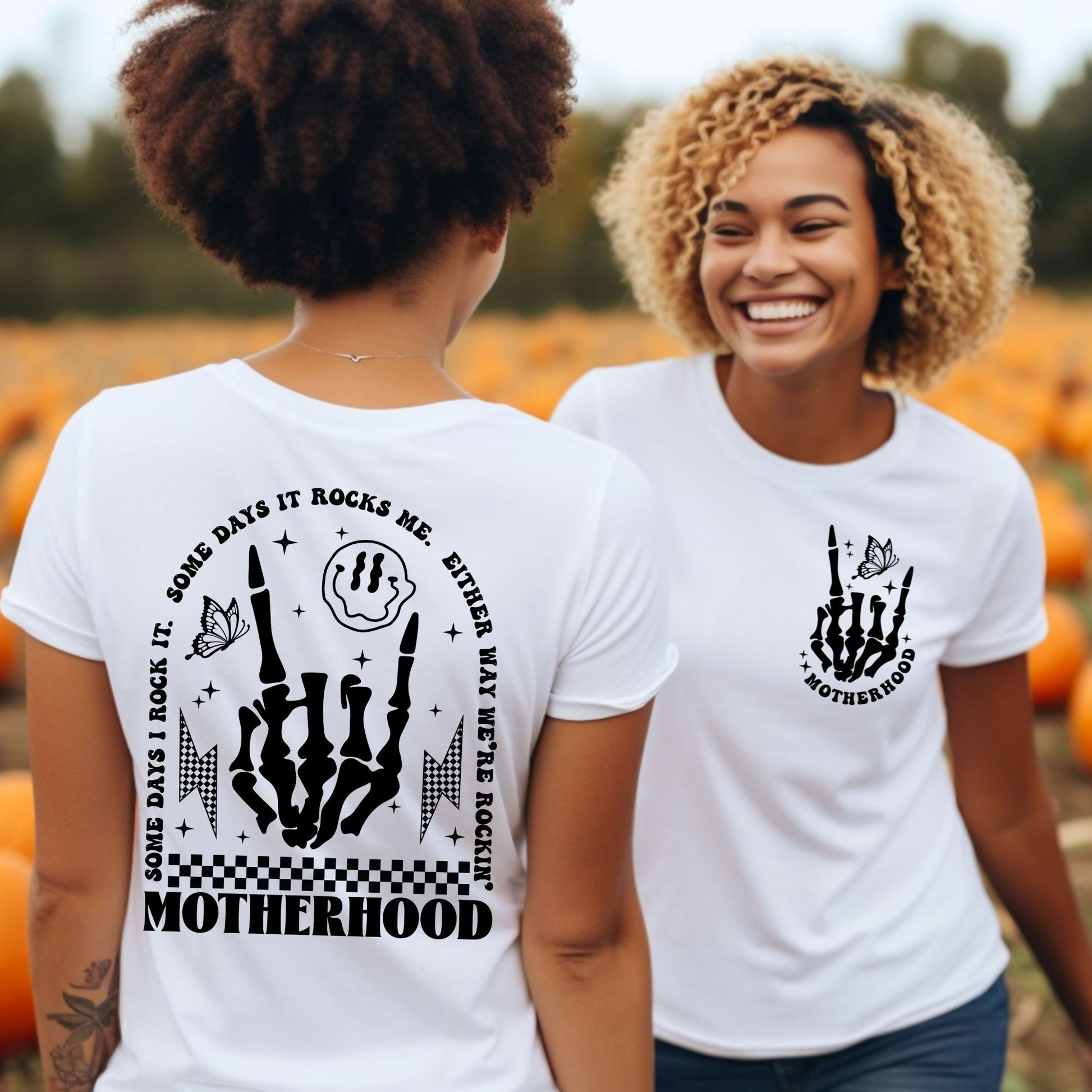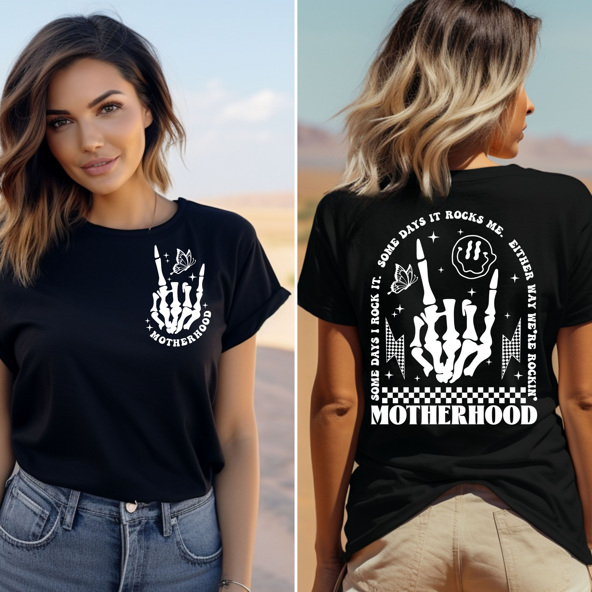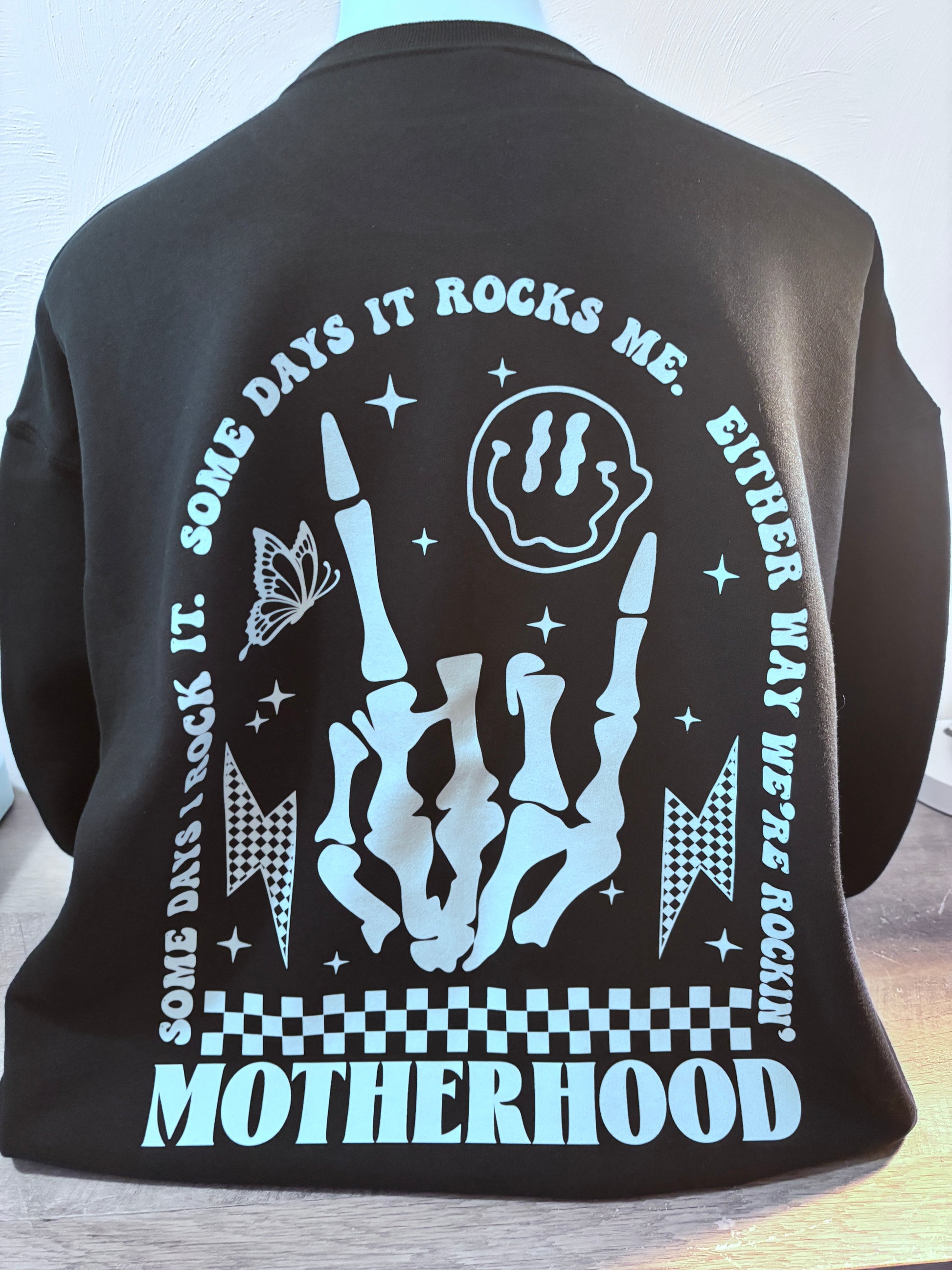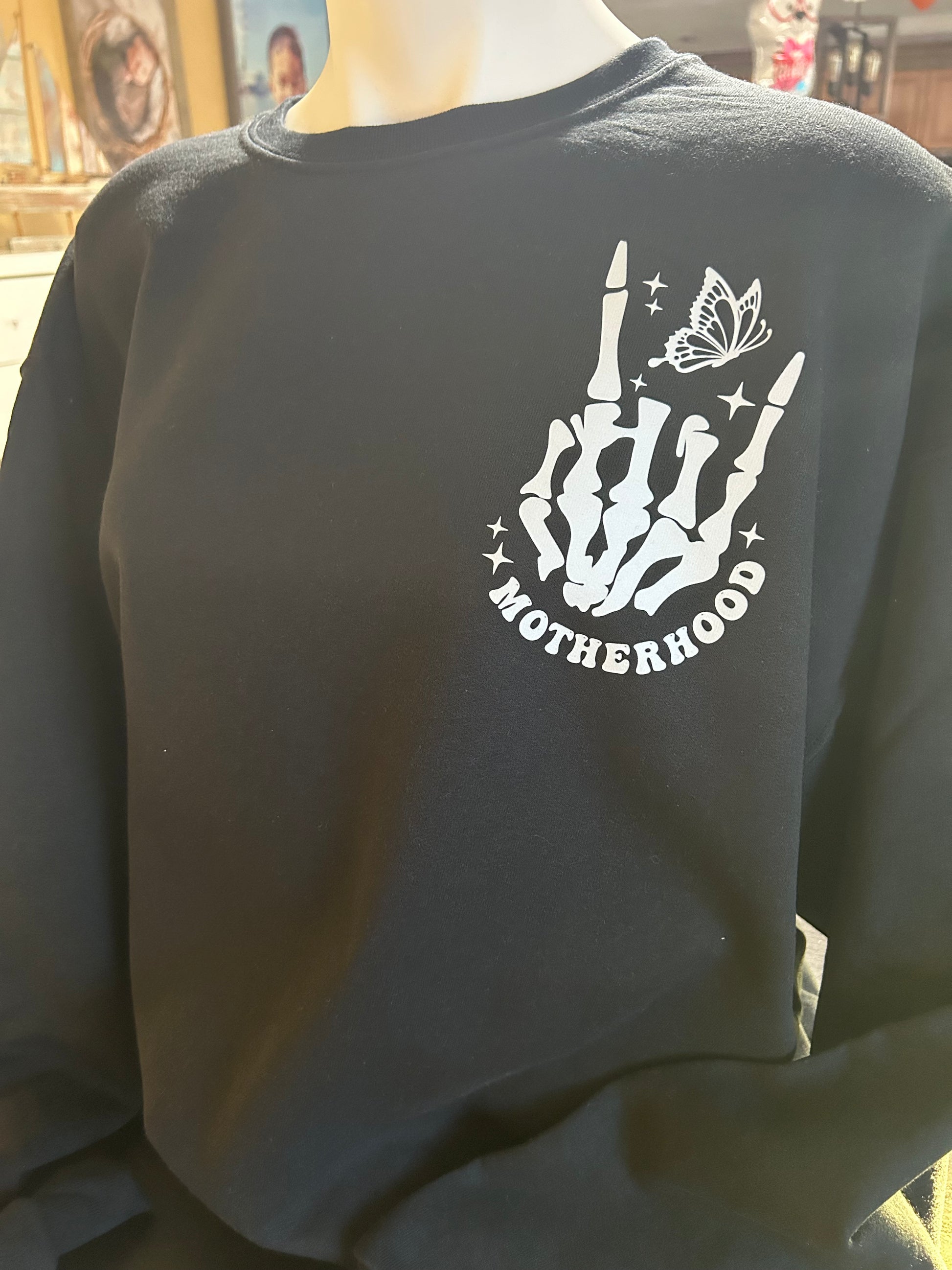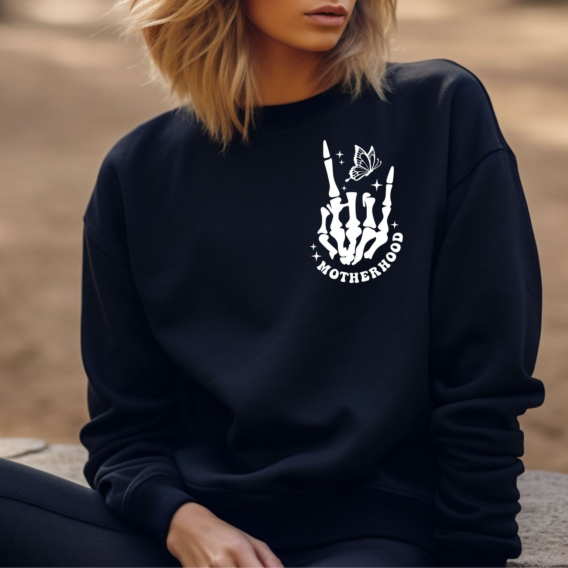 Elevate your mom wardrobe with our Humorous Skeleton Rockin' Motherhood Crewneck Sweatshirt!