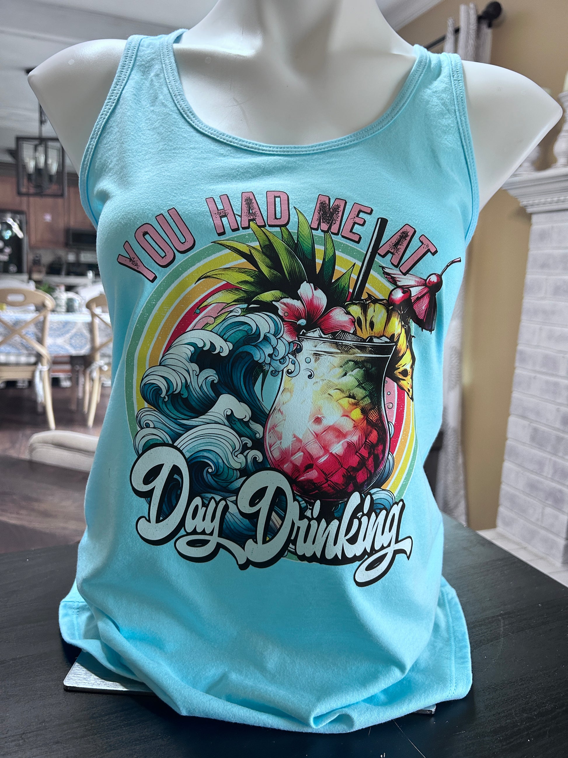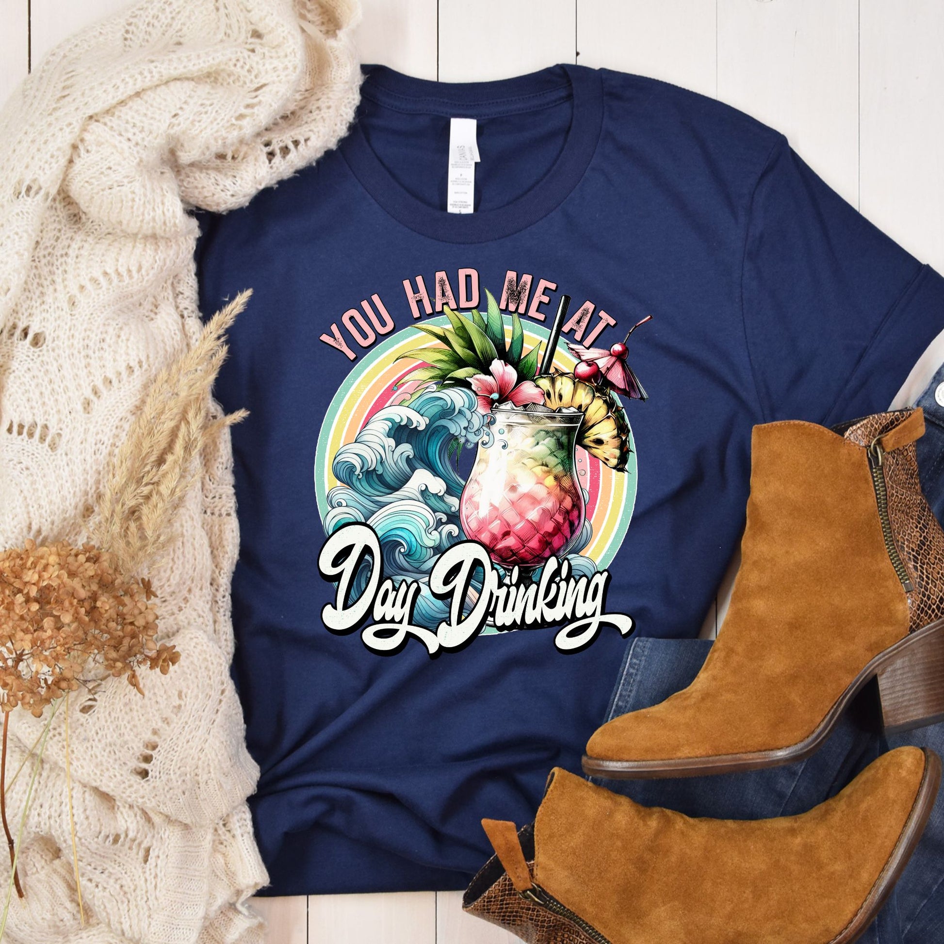 Looking for a way to liven up your wardrobe? You'll be saying "You Had Me at Day Drinking" when you see this playful tee that celebrates relaxing in the sun with drinks in hand. This vibrant graphic tee features: